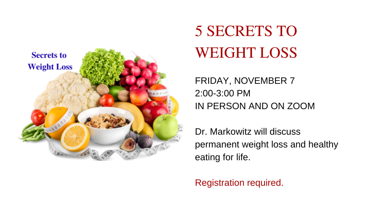 Dr. Markowitz will discuss permanent weight loss and healthy eating for life. Topics include: