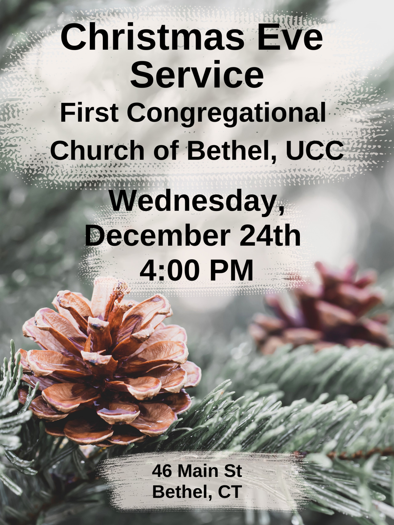 You are invited to celebrate Christmas at the First Congregational Church of Bethel, UCC on Christmas Eve at 4 pm. Join us for our family service as we hear the Christmas story, read the scriptures together, and sing Christmas carols.