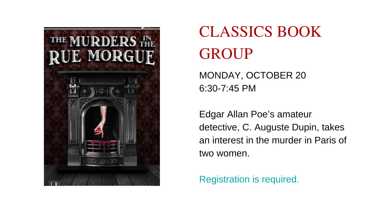 This month's selection is The Murders in the Rue Morgue by Edgar Allen Poe. This is a short story by Edgar Allan Poe first published in "Graham's Magazine" in 1841. It has been recognized as the first modern detective story; Poe referred to it as one of his tales of "ratiocination," his concept of analyzing a fictional crime to find the resolution.