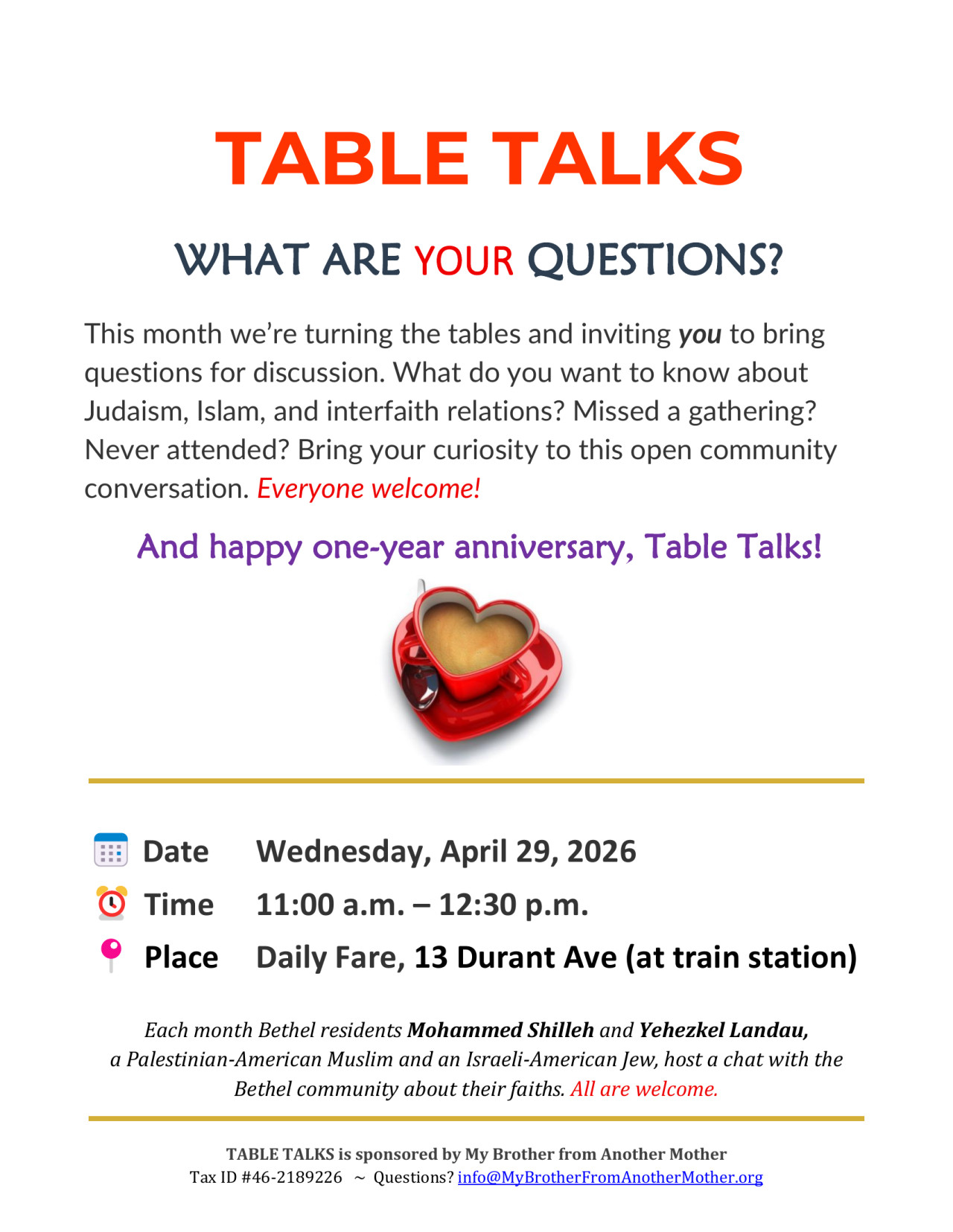 This month we’re turning the tables and inviting the community to bring questions for discussion. What do you want to know about Judaism, Islam, and interfaith relations? Missed a gathering? Never attended? Bring your curiosity to this open community conversation. Everyone welcome!